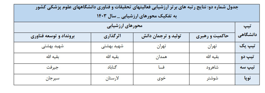 این ارزیابی در چهار محور تولید و ترجمان دانش، فناوری، اثرگذاری و حاکمیت و رهبری صورت گرفته است.